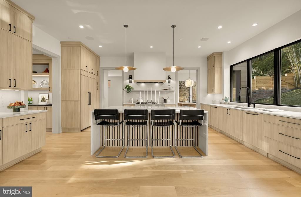Enviable Kenwood Park location just a mile to downtown Bethesda, this newly constructed Mid-Century Modern masterpiece, built by Foxhall Homes and designed by Elie Ben Architecture, balances sophisticated design with livability, featuring a private Savaria Eclipse elevator and seamless indoor-outdoor living. <br> <br> Expansive outdoor living spaces including covered porches, second floor balcony, and slate grilling patio define the home’s signature aesthetic. Wide-plank white oak floors, Visual Comfort lighting, solid-core doors with Emtek concealed fastener hardware, and illuminated tray ceilings throughout the main level reinforce an organic modernist feel. Architectural Digest named Visual Comfort as *one of the best sources for great lighting allowing optimal ambiance at any time of day.* <br> <br> The heart of the home is a chef’s kitchen anchored by an 8-foot Le Blanc Quartzite island surrounded by sleek European style cabinetry. The culinary engine is a JennAir 48” Noir professional range paired with paneled 48” Jenn-Air refrigerator. The fully equipped butler's pantry with integrated under shelf lighting, wine refrigerator and sink serves as a discreet service area for effortless hosting and organized storage. <br> <br> Open living spaces are designed for presence and comfort. A sculptural ring chandelier with burnished brass and fluted glass shades floats above the gas fireplace. The family room, with illuminated tray ceiling accents, features direct access to the full-width bluestone covered terrace overlooking the serene yard. <br> <br> The primary suite is a sunlit sanctuary with expansive views from the triple casement bathroom windows and a quad-set in the bedroom. The spa-inspired bath offers radiant-heated floors, curbless two-person shower with thermostatic controls, six-foot solid-surface tub with Kallista filler, and white oak vanities illuminated by sconces from Visual Comfort. <br> <br> The lower level impresses with nearly 10-foot ceilings, a full service bar, custom home gym, and premium finishes—ideal for media, entertaining, or overnight guests. <br> <br> Beyond stunning aesthetics, this home is engineered to last, exceeding building standards with superior materials: Huber ZIP System sheathing, Advantech subflooring, and Andersen 400 Series casement windows. The low-maintenance exterior combines Hardie Artisan and Boral composite siding with elegant cut stone accents from El Dorado—built to look flawless for decades. <br> <br> Smart & Efficient Systems include: <br> <br> - 5-zone in-ceiling speakers with Sonos and VSSL amplification and AirPlay <br> - Dual-system, Four zone Carrier high-efficiency HVAC with Ecobee thermostats <br> - Pre-wired for full security suite and a whole-home mesh network <br> - EV-ready garage with R-9 insulated high-lift door and epoxy painted floor <br> - 85” TCL TV with Sonos surround sound and subwoofer in Recreation Room <br> - 65” Samsung Frame TV in the Family Room <br> <br> Timeless Mid-Century design meets uncompromising craftsmanship in an unbeatable private setting. Schedule your private tour and experience the distinct character firsthand.